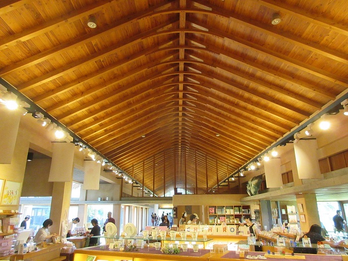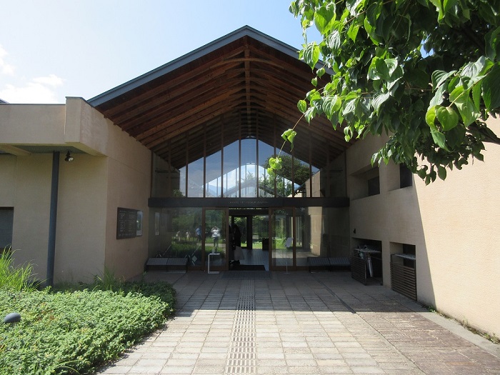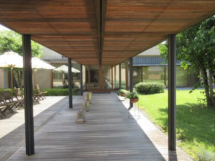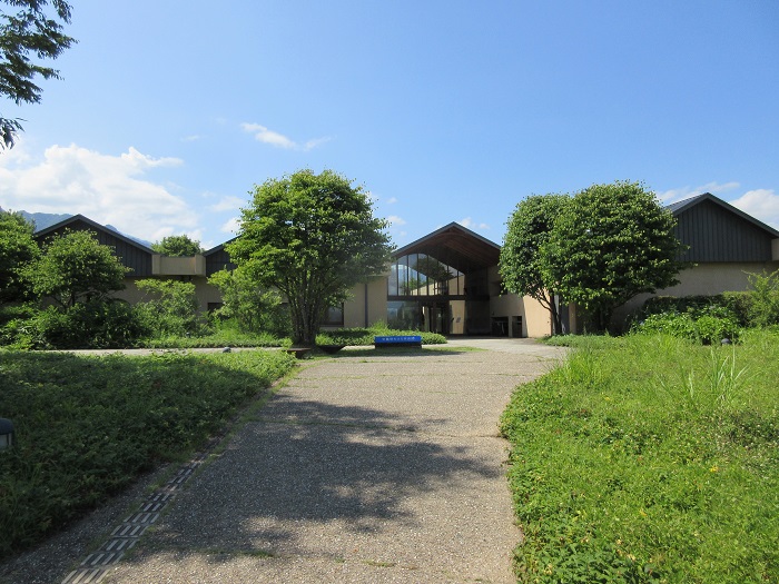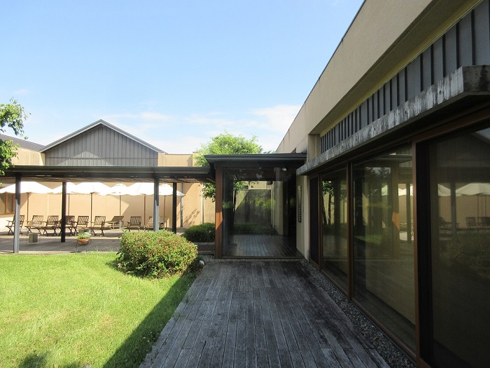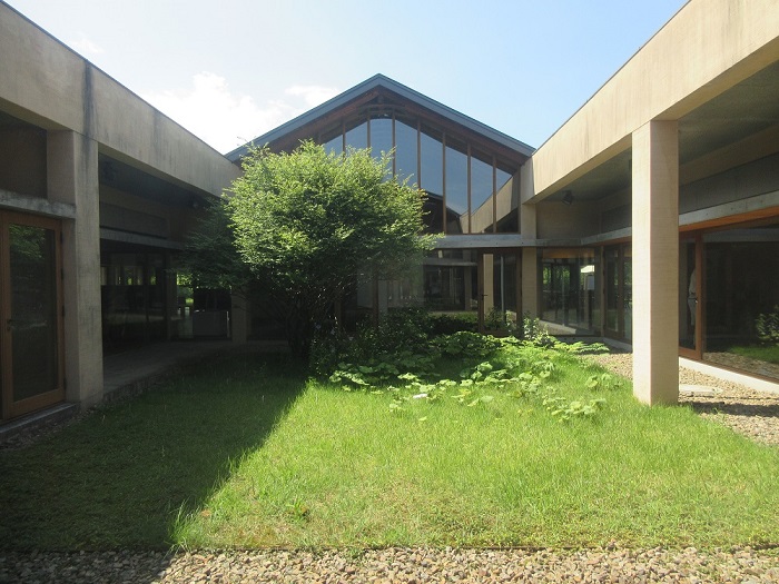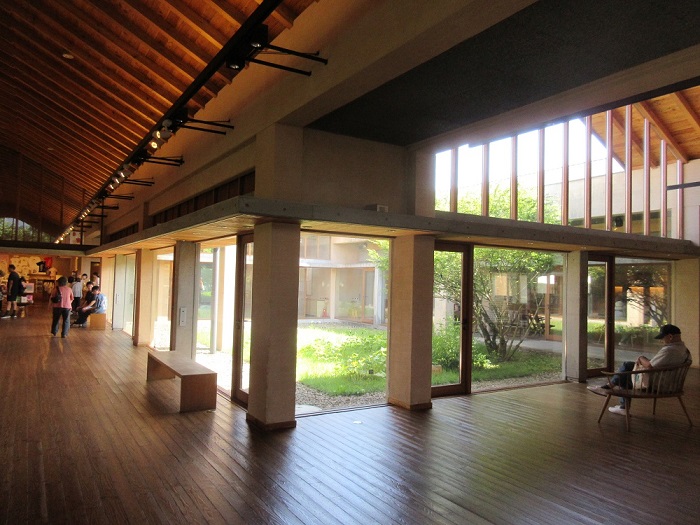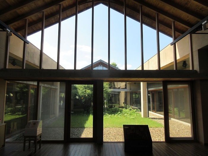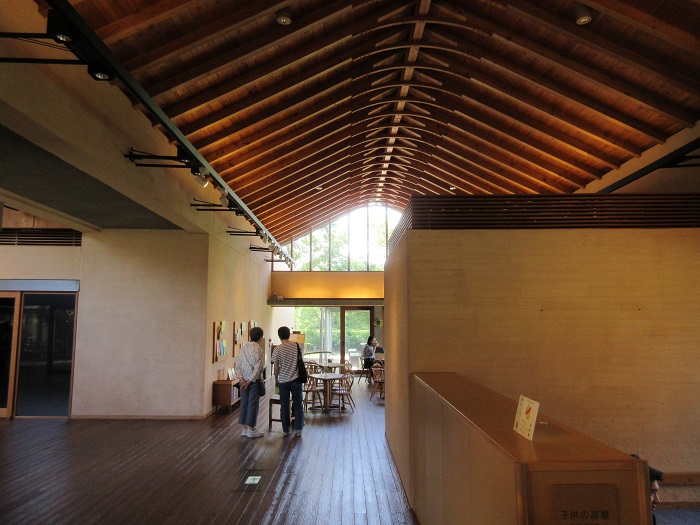 「安曇野ちひろ美術館」(設計:内藤廣)広々とした公園内に、分割された切妻屋根の建物が並んでいます。内部は木造の小屋組みが美しく、塗壁や床のフローリングなど住宅に近い感覚で温もりがあり、また何処にいても周囲の自然を感じるように開放感があります。