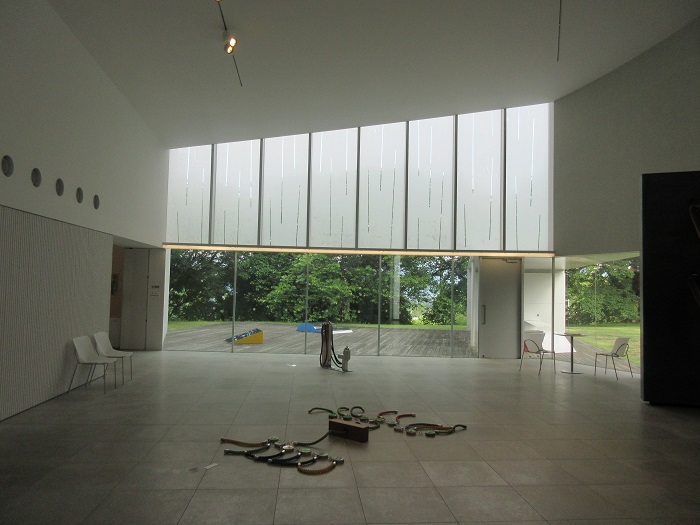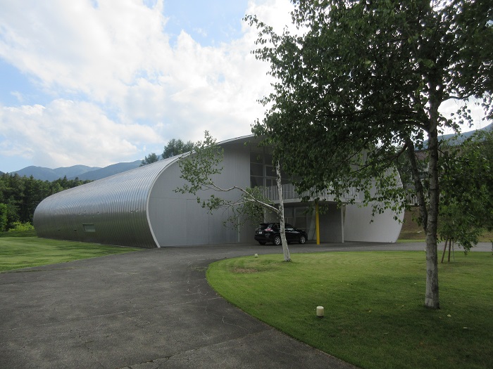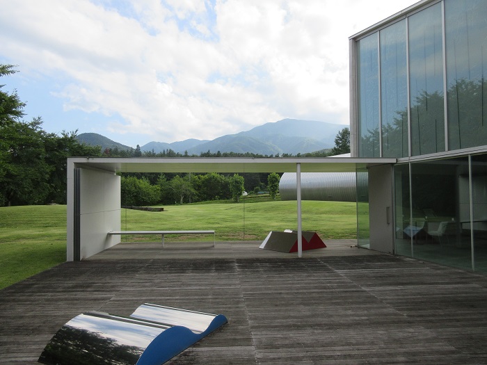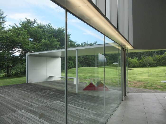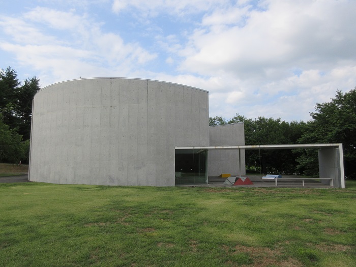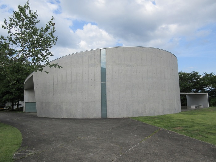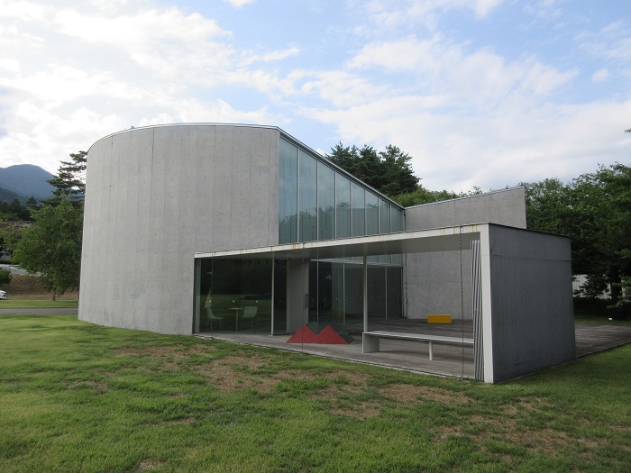 安曇野市にある「ハーモニック・ドライブ・システム」の敷地内にある現代アートのギャラリー「TRIAD IIDA-KAN」(設計:槇文彦)緑豊かな敷地にアールのコンクリート打ち放しのシンプルな外観、館内も屋外テラスと繋がり開放感があります。