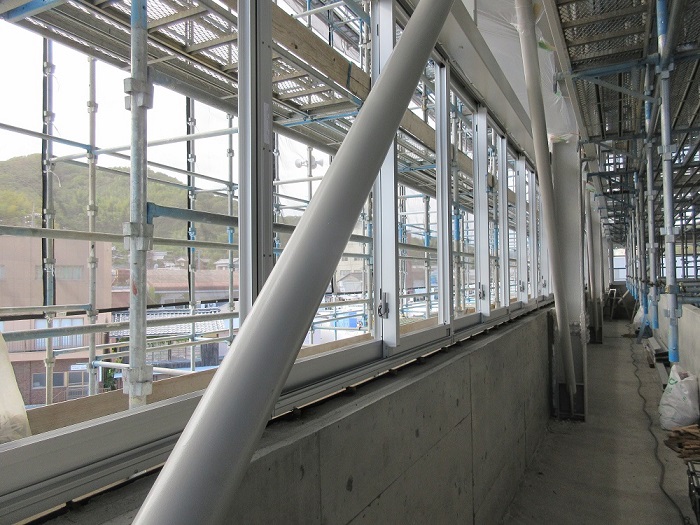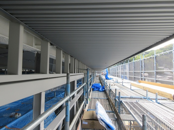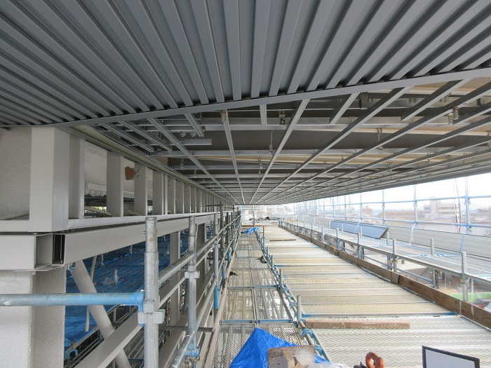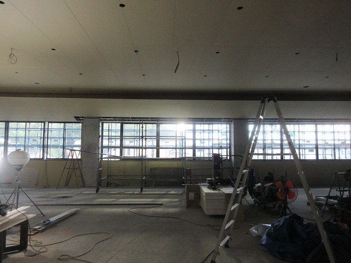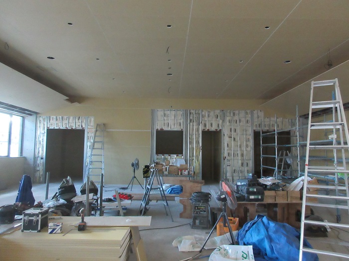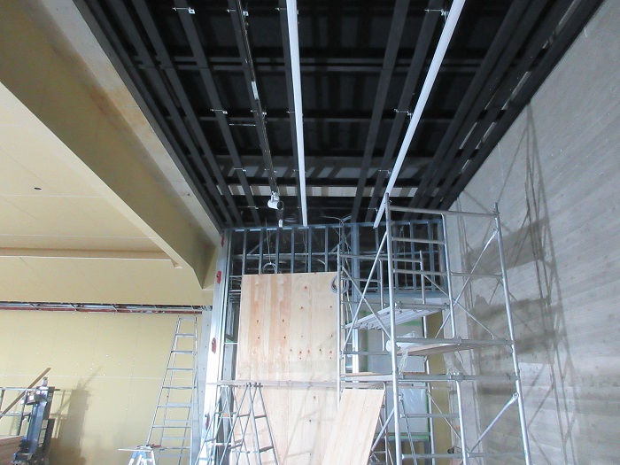 What’s New2階大ホールのボード張り2025.10.24What’s NewPrivate Blog2階大ホールの壁・天井のボード張り~ステージ上の鉄骨ぶどう棚取付け、体育館のサッシ取付けや軒天のスパンドレル張りも進んでいます。 2階の耐火被覆前の記事