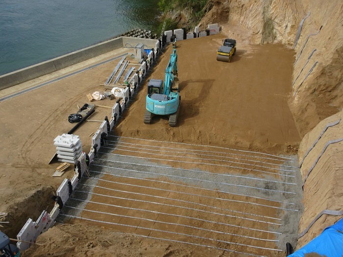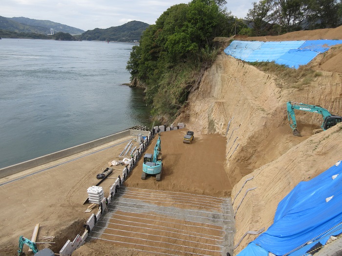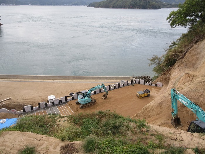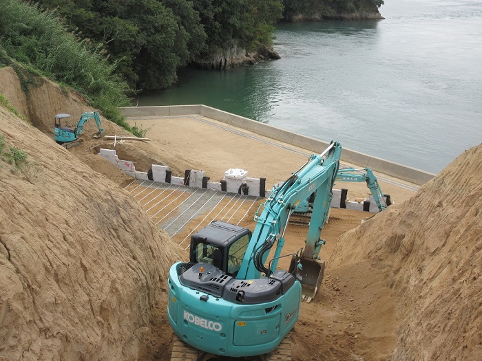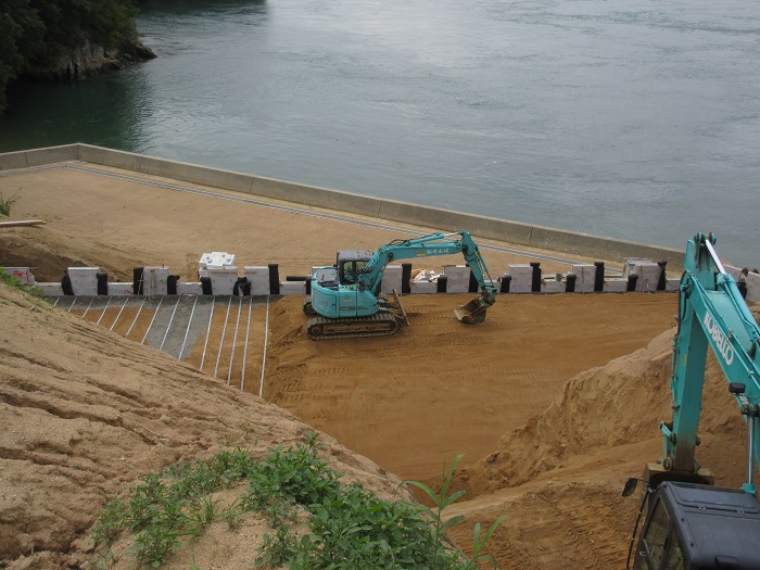 コンクリート擁壁ブロックが少しづつ上がっています。