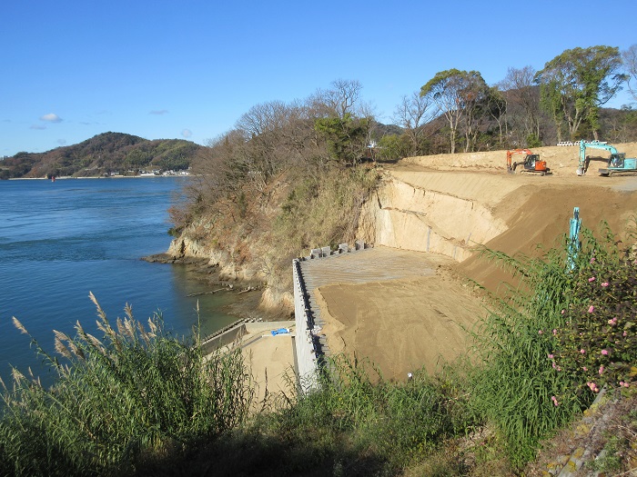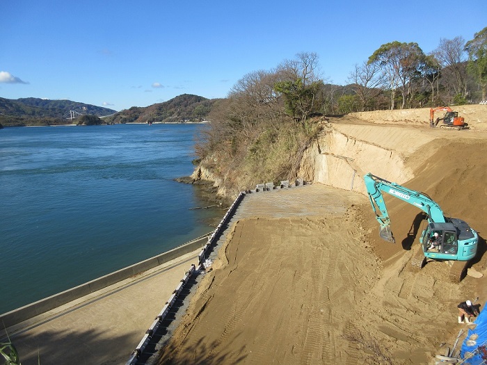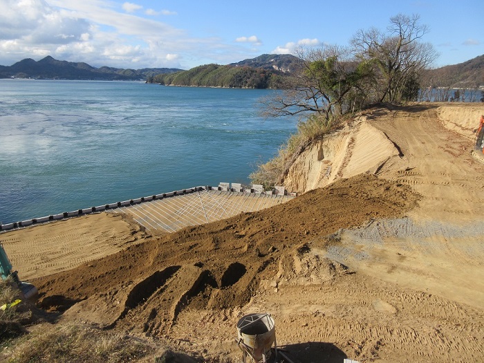 土留めコンクリートブロックが予定の9mの高さまで組み上がりました。