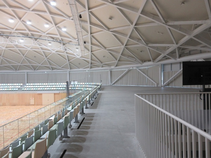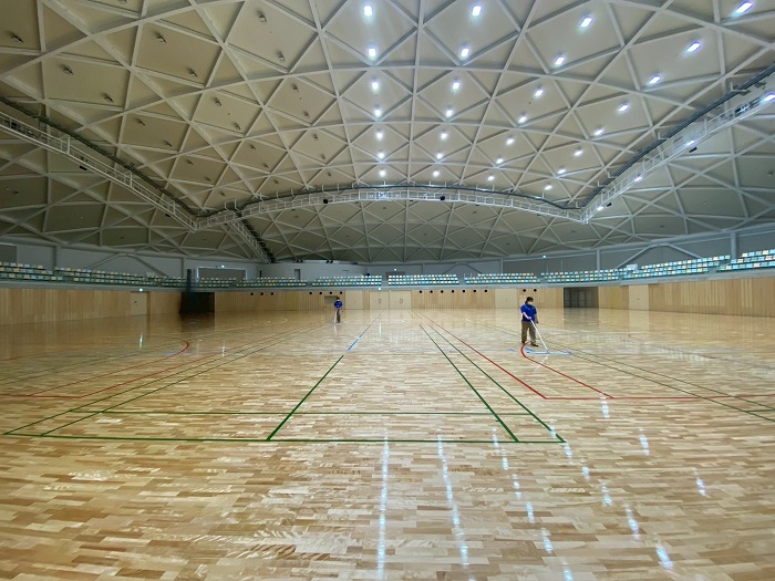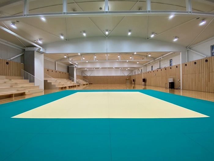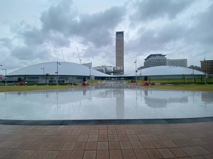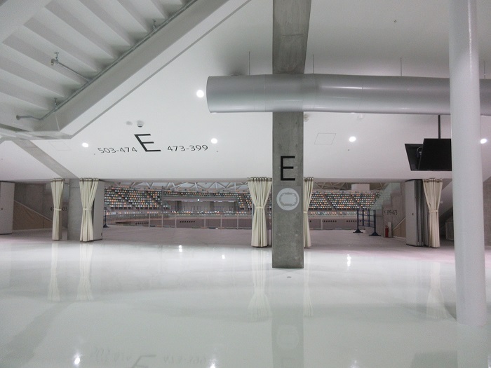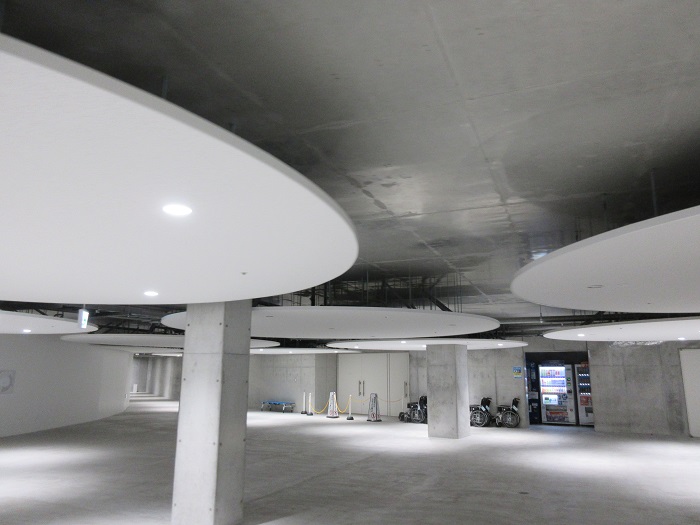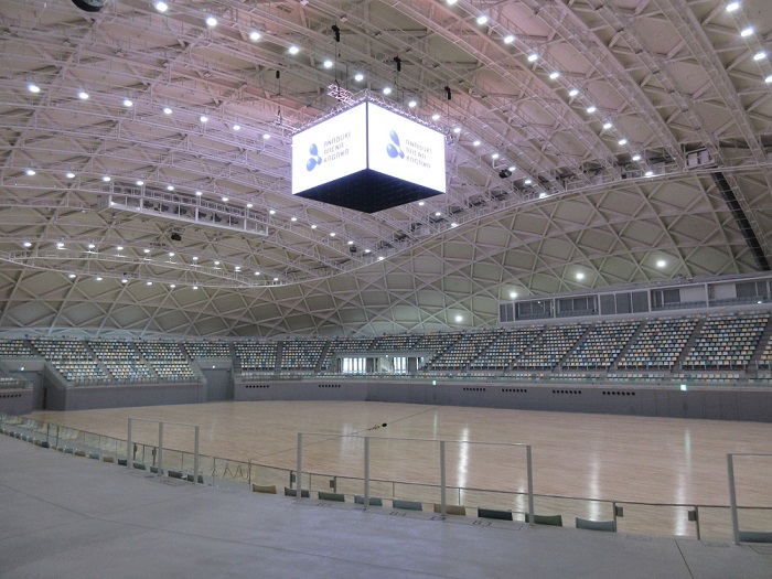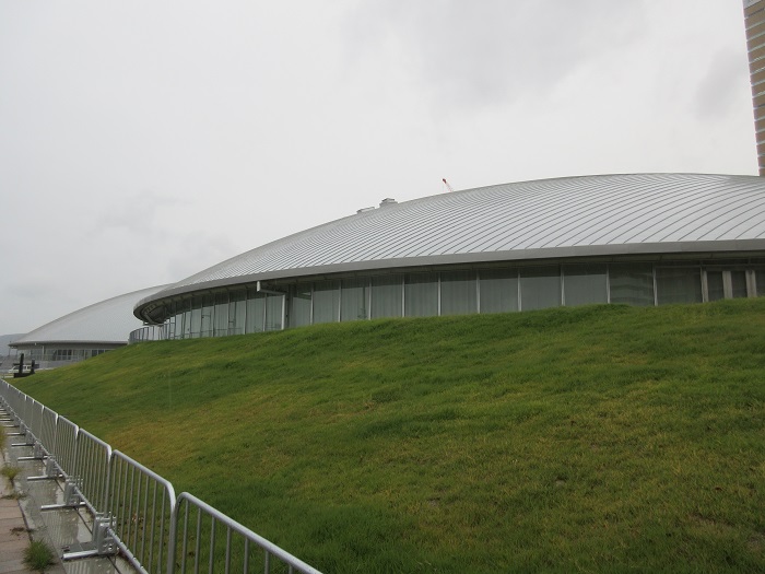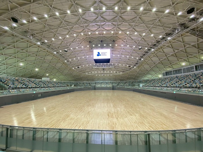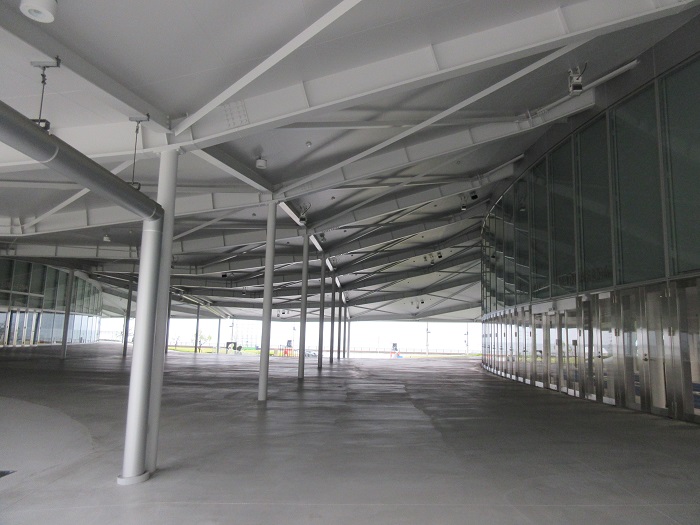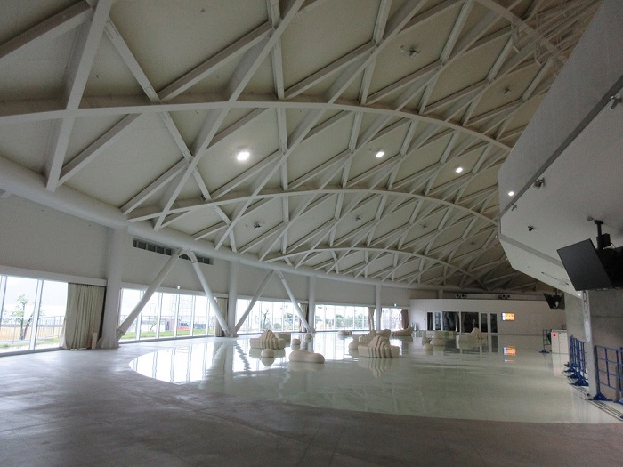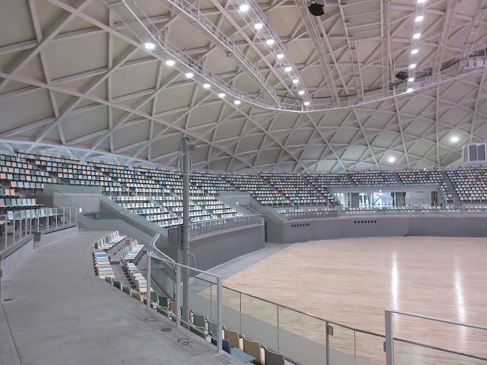 「あなぶきアリーナ香川」(設計:SANAA)海に面して最大1万人収容のメインアリーナ、サブアリーナ、武道施設があり、白く柔らかい曲線でアリーナを掘り下げて周囲への圧迫感を抑えています。内部も白く柔らかい曲線に包み込まれた空間が広がっています。交流ホールは大きな開口部を設けて海と繋がっています。