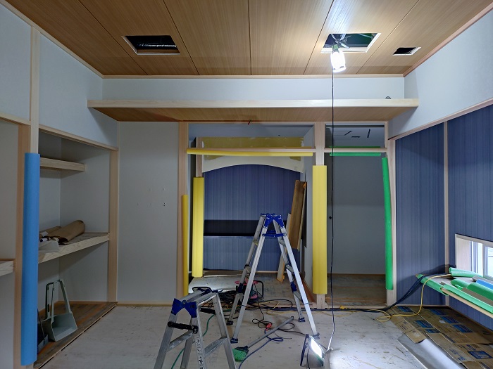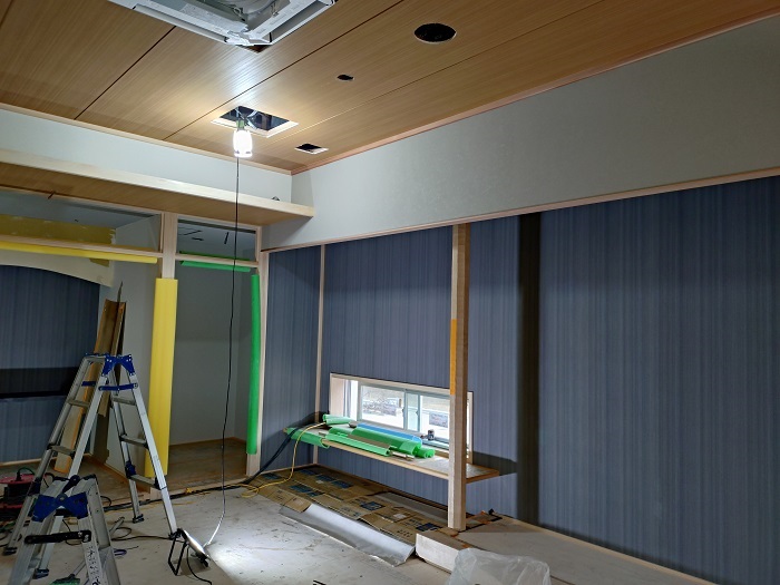 What’s New公民館の和室2026.02.03What’s NewPrivate Blog「和室」の造作工事が終わり、壁のクロス張りが進み、折版屋根の断熱防水工事~駐車場の花壇部分の施工中です。 点字ブロック前の記事