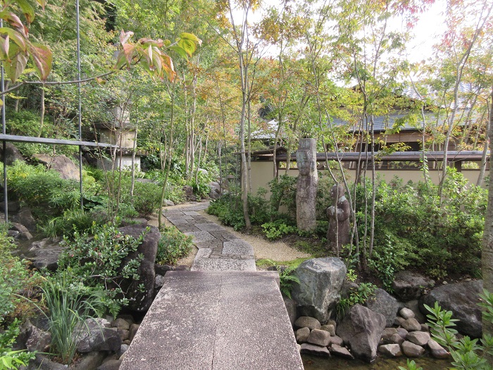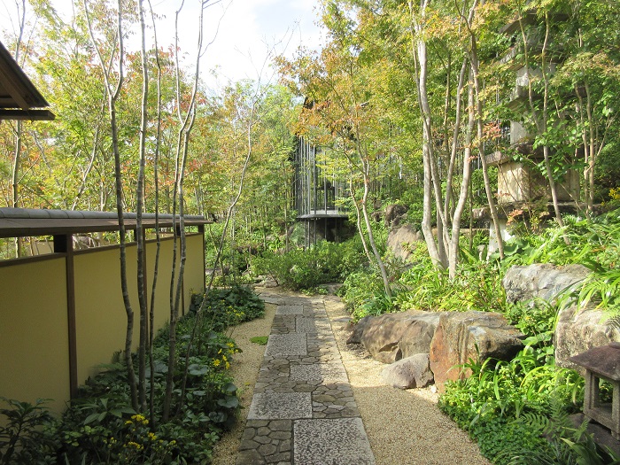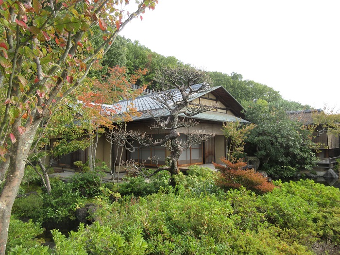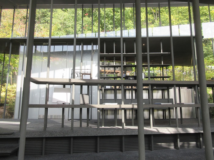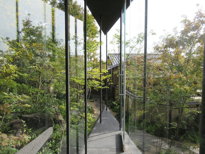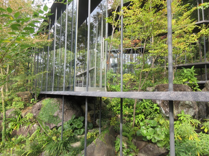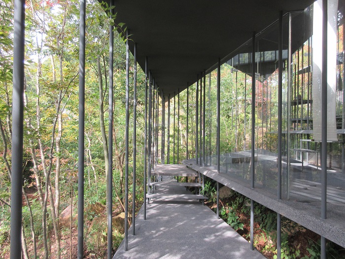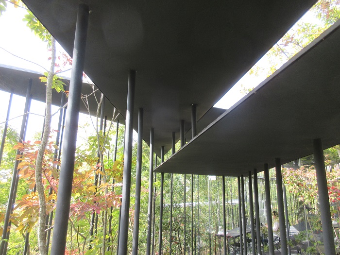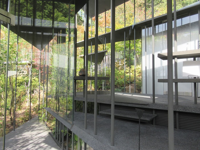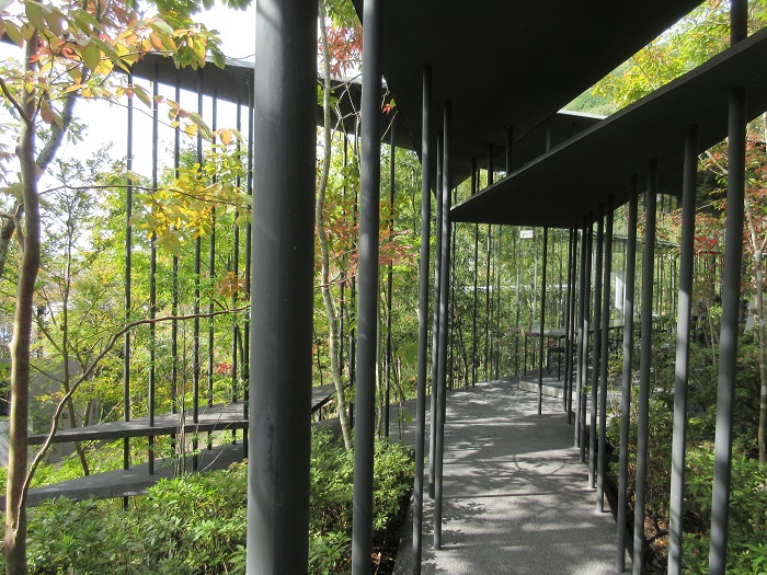 福武書店の迎賓館「福武トレス」半田山を借景とした雑木の庭に、数寄屋造りの「Fサロン」全面ガラスの「Fギャラリー」と「Fスタジオ」があり、「Fサロン」では素朴な中にも様々な工夫と素材を観る事ができます。「Fギャラリー」はガラスと細い鉄の丸柱で構成された斬新なデザインですが、室内に入っても雑木の庭の中にいるような自然に溶け込んだ空間です。