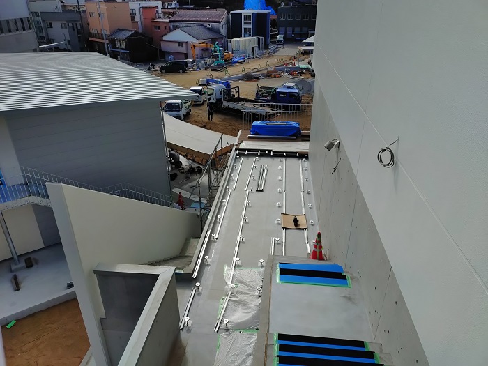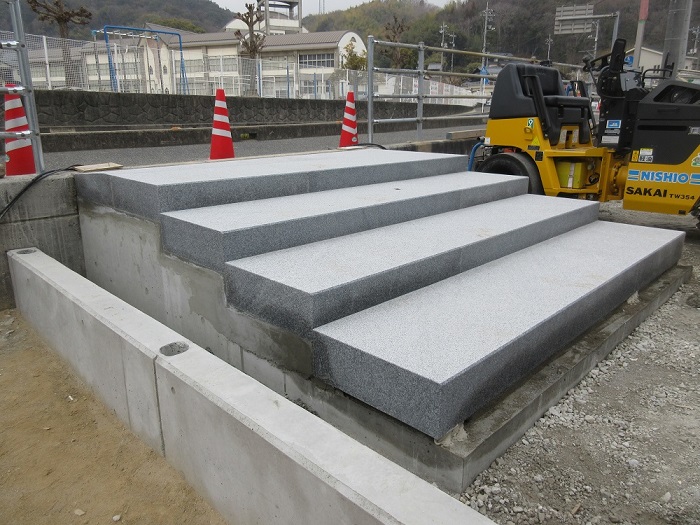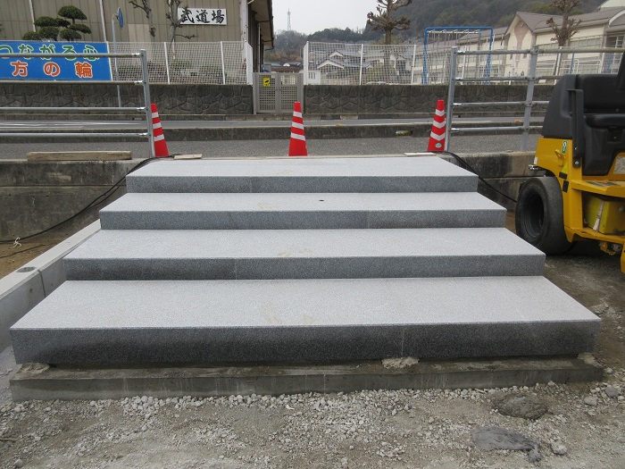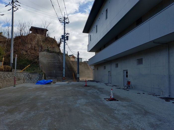 What’s New歩行者進入路2026.02.19What’s NewPrivate Blog西側の歩行者進入路の大島石の階段が設置され、北側駐車場の路盤工事~3階のキッチン搬入・取付けも進んでいます。 造成工事前の記事
