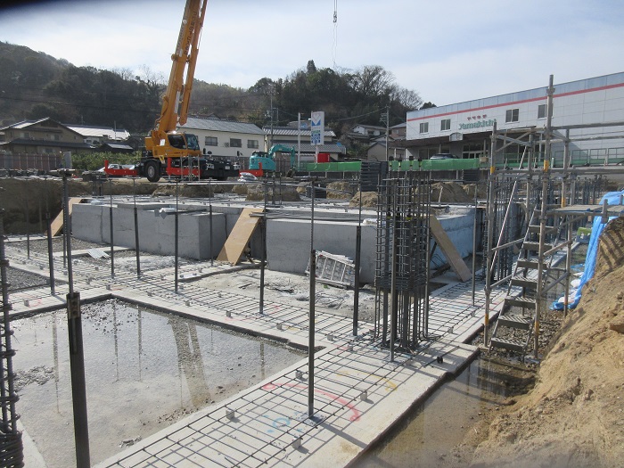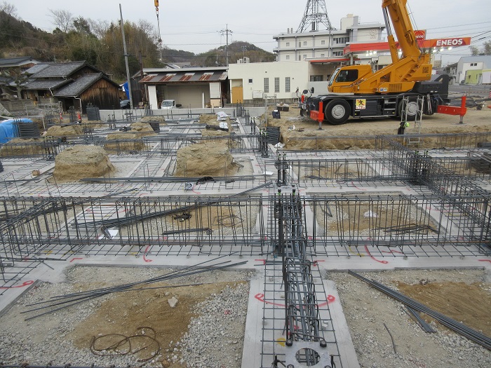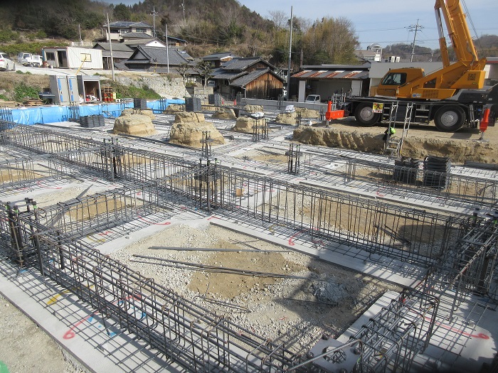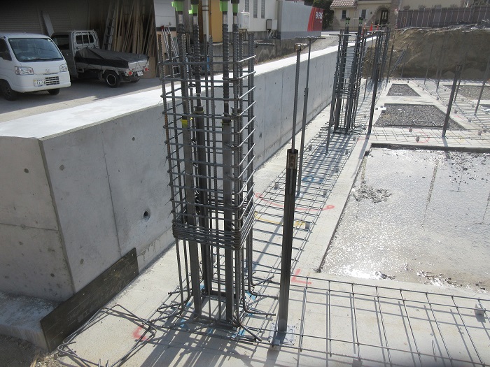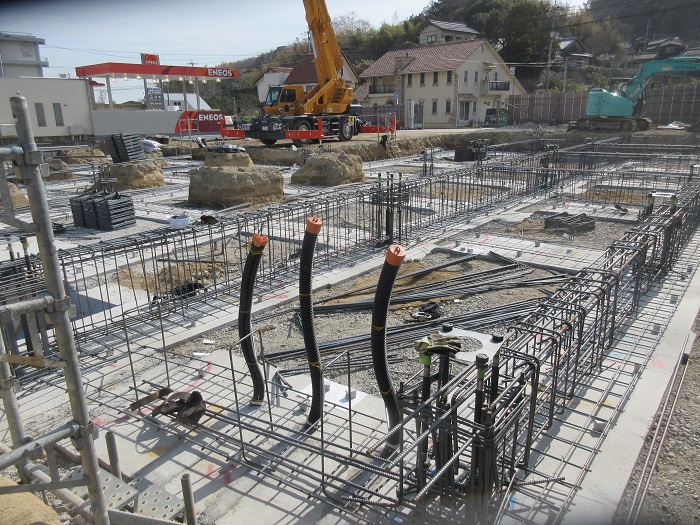 ベースパックの設置~ベース筋、地中梁の配筋工事が始まっています。