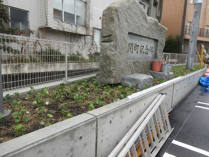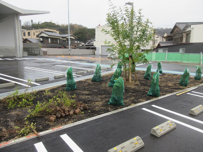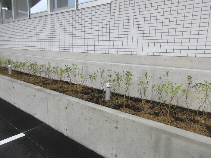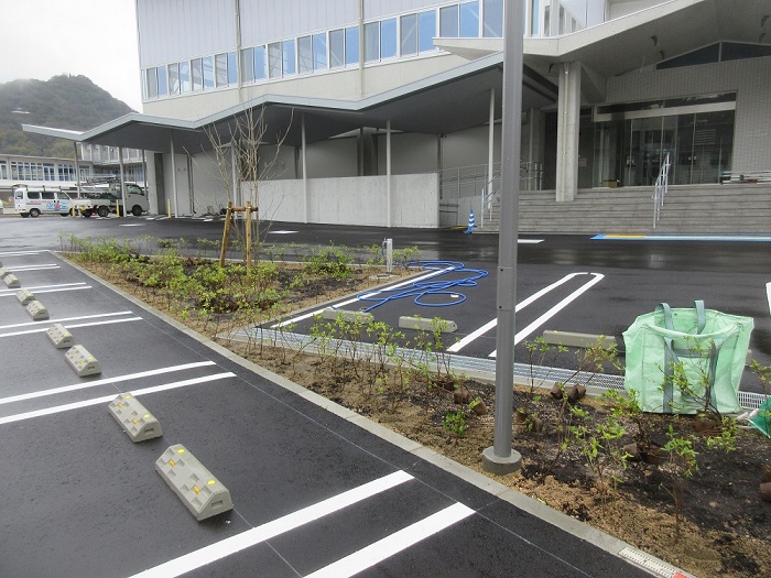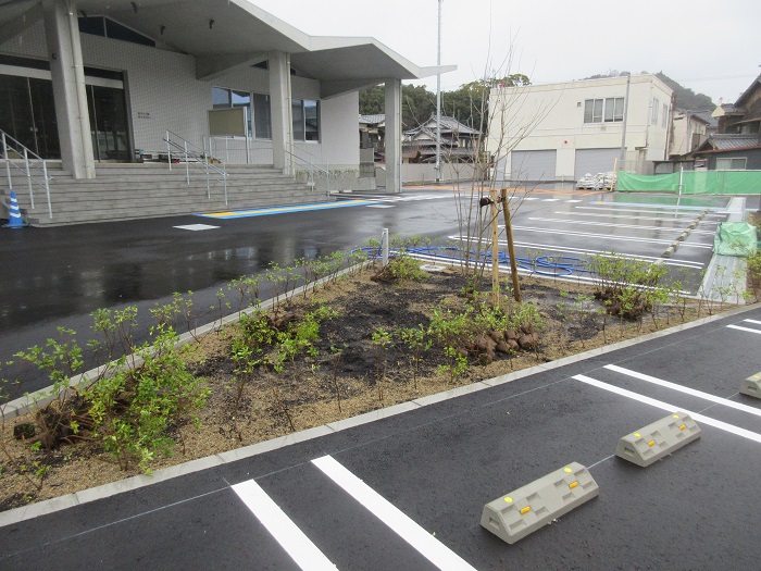 「公民館・体育館」の駐車場やスロープ横の植栽工事中です。