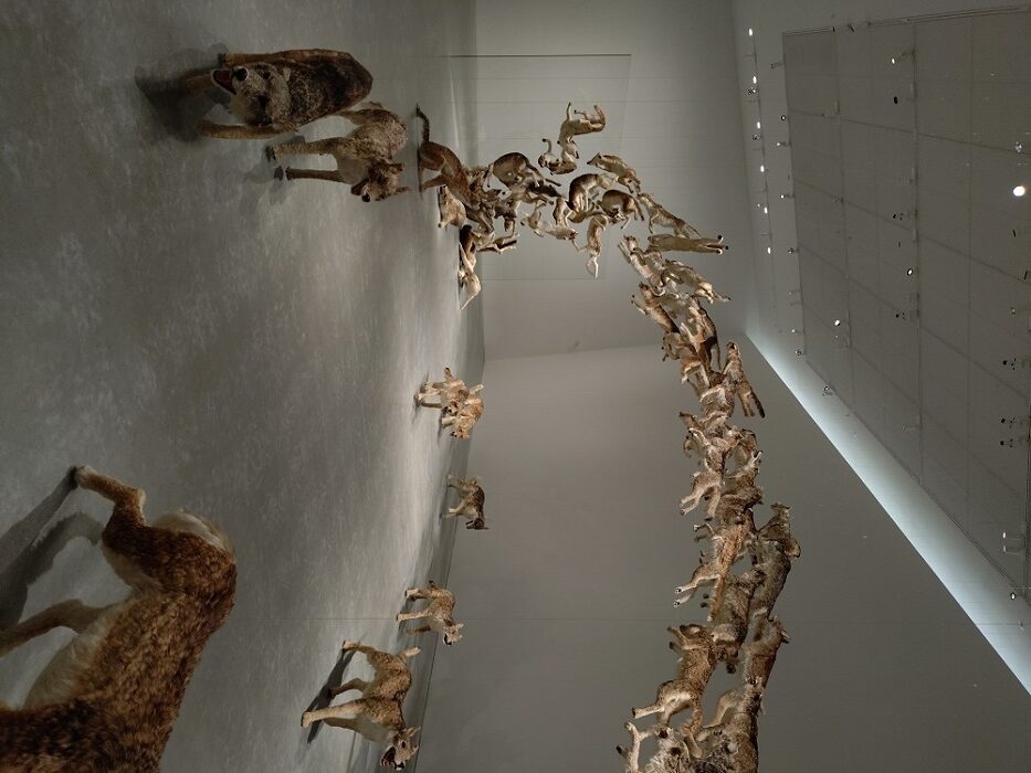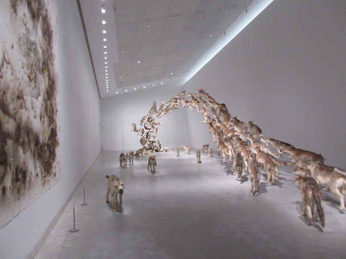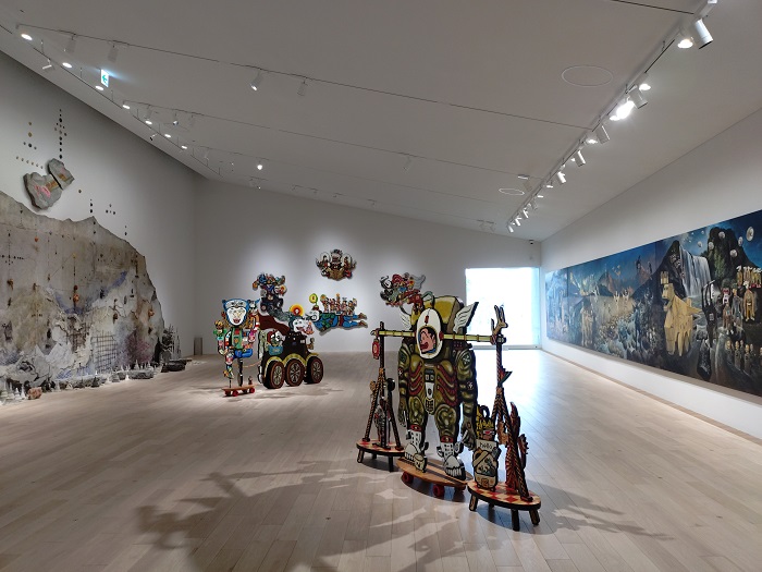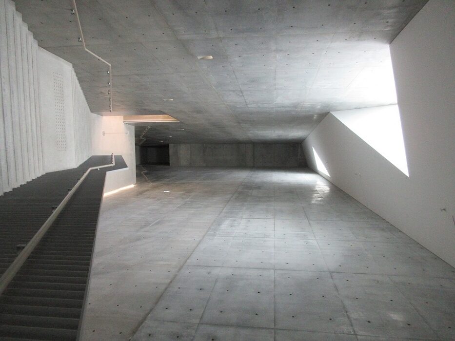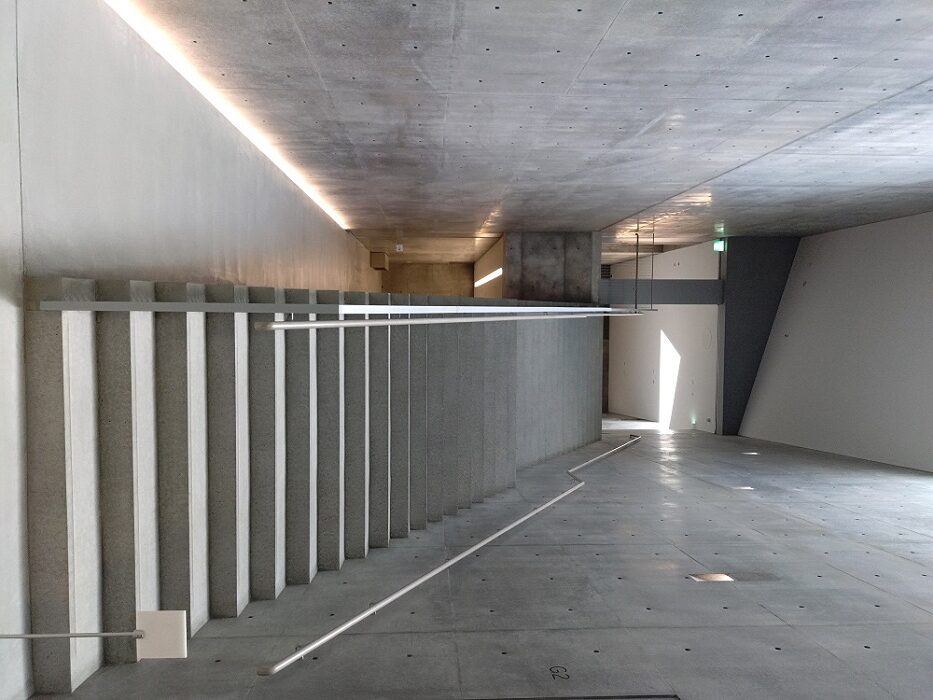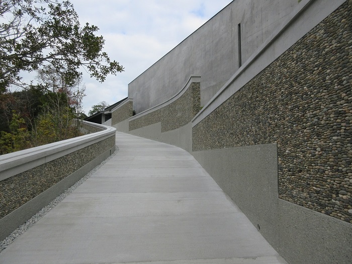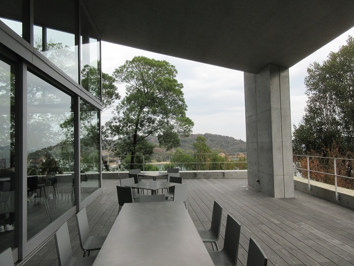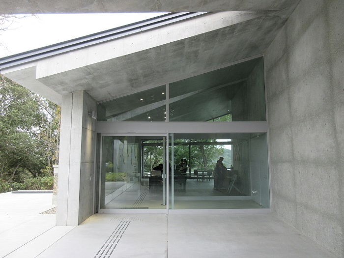 「新直島美術館」(設計:安藤忠雄)地上1階、地下2階のためアプローチからは建物の全景は観えず、周囲の緑に囲まれるようになっています。玄関の反対側にはカフェがあり屋外テラスが気持ち良さそうでした。この美術館の最大の見せ場は地下に下りる階段ホール、コンクリート打ち放しの薄暗い空間にトップライトからの光が入りアートのような空間です。特徴的なアート作品が点字され見応えがありました。