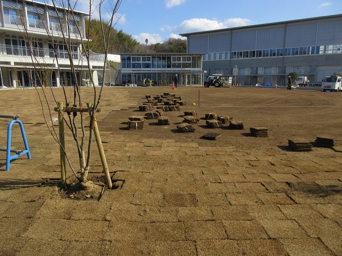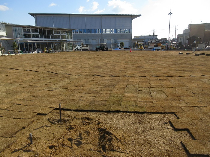 円形の広場に芝生を一枚づつ張っています。