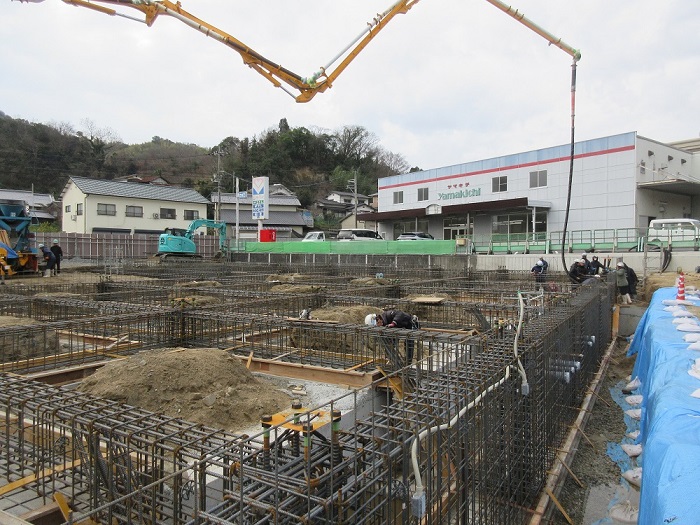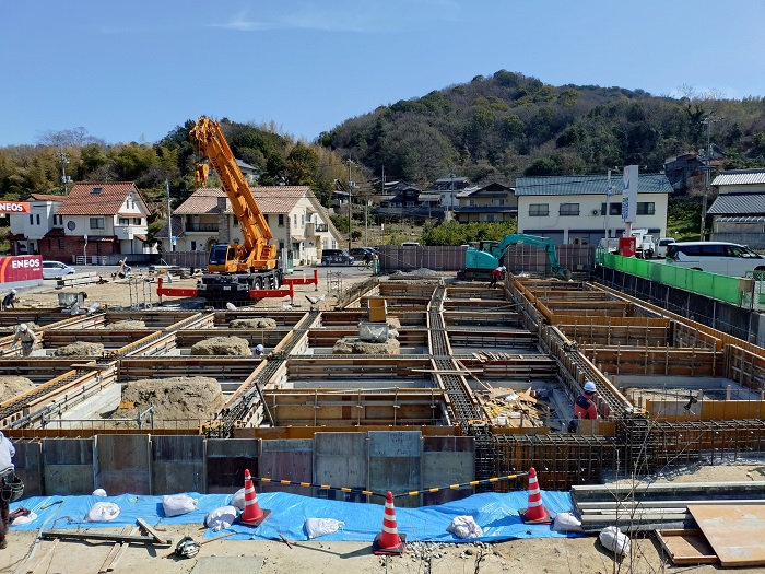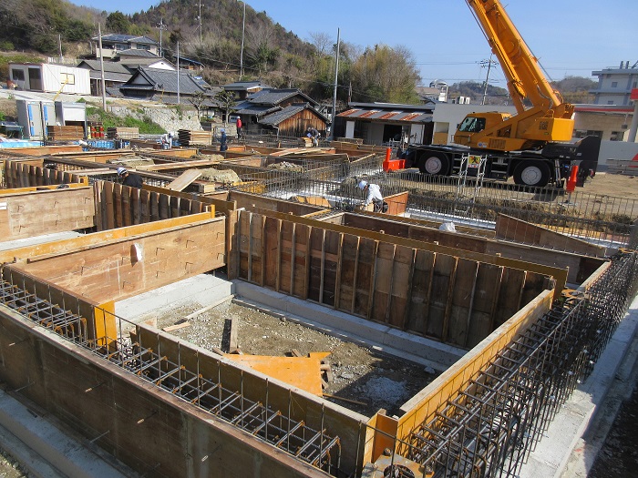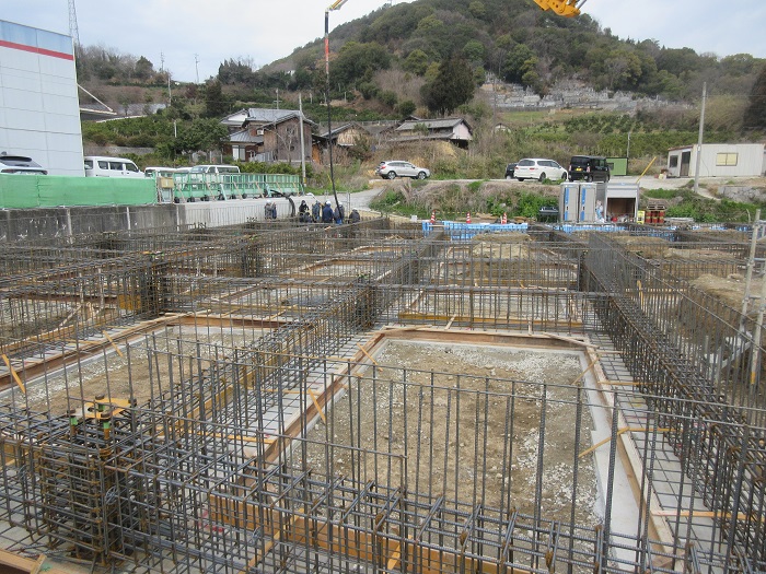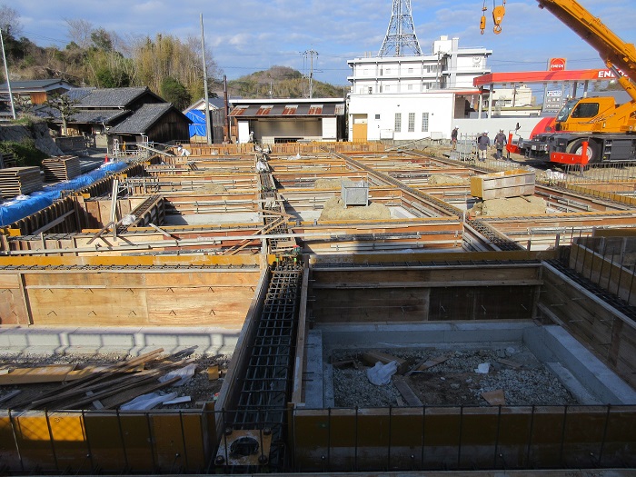 ベースのコンクリート打設が終わり~地中梁の型枠工事中です。
